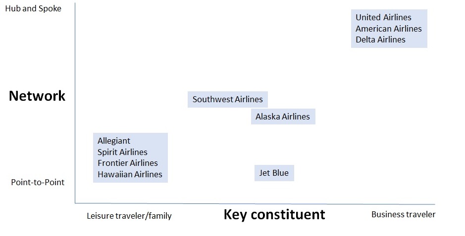 Strategic grouping reveals the different competitive positions that rivals occupy in your segment. For example, see the chart below, where the two axes (network and traveler profile) give you a birds-eye-view of the various competitors in the US airline industry and how they compete along these dimensions. You can plot the strategic grouping chart in more than one way, each with different axes, to show how the various competitors stack up against each other along different dimensions. For example, the chart below can also be drawn along network and price as the two axes, to show how various airlines also compete along those two dimensions. Key is to choose the right axes for the analysis. The selected axes (i.e., dimensions) should be strategic drivers in your space – i.e., the various players make a conscious decision to complete along those dimensions.